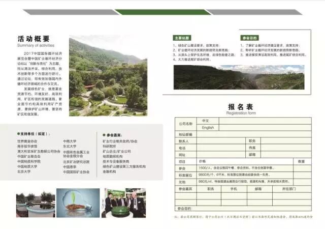 主要议题(暂定)1、矿业循环经济发展的新趋势及新思路; 2、我国绿色矿山建设要求与政策支持; 3、环保税法对矿山企业的影响及应对措施; 4、构建矿区环境治理与修复产业新模式; 5、氰渣处置与利用技术现状及发展趋势; 6、废渣综合利用之新型节能环保防火保温建筑材料; 7、汉麻高产经济作物在矿区生态修复中的产业化; 8、尾矿微晶技术的应用与产业化。