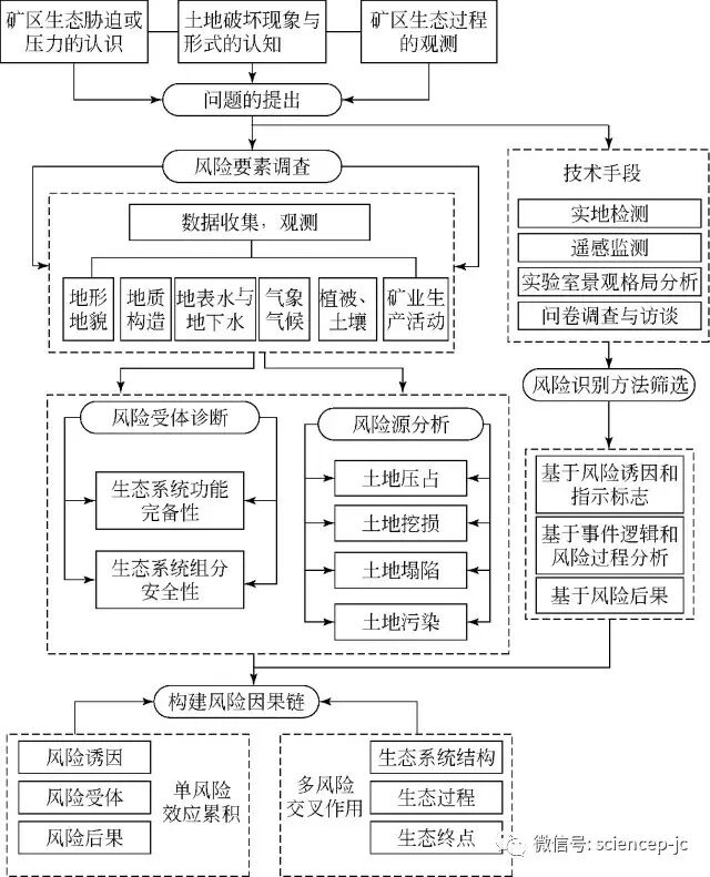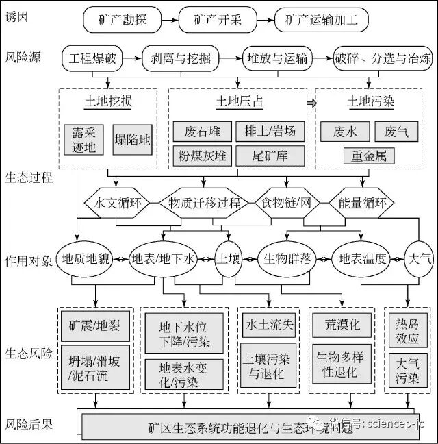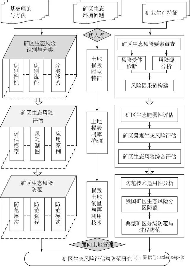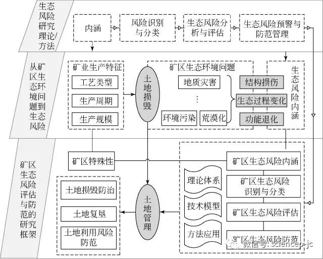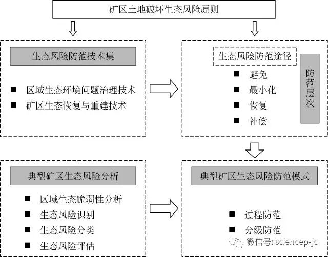 矿区生态风险是由矿业生产活动引发的直接或间接引发该区域内生态系统发生不利变化的可能性, 它与矿区自然地理条件、矿业生产/ 工艺特点密切相关。综合目前国内外矿区生态风险研究热点领域, 本研究围绕矿区生态风险中的首要风险源——土地损毁, 面向土地利用及风险管理, 开展矿区生态风险评估与防范研究。针对我国矿区凸显的土地损毁问题, 面向土地管理构建矿区生态风险评估与防范研究体系, 旨在识别我国矿区生态风险源, 进行矿区生态风险综合评估, 并据此明确矿区生态风险防范技术, 进而保障矿区生态安全, 促进矿区社会经济与生态可持续发展, 为推进矿区生态文明建设奠定基础。