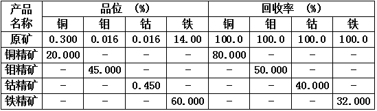 充分利用矿物的等可浮性,采用阶段磨矿,部分混合浮选,在弱碱性介质中采用中性油作捕收剂,先浮铜钼,再用丁黄药及丁铵黑药选钴,选钴尾矿用弱磁选机选铁,铜钼混合精矿再磨,采用硫化纳抑铜浮钼分离选,铜钴精矿再磨再选,最后得到钴精矿和铜精矿的流程。