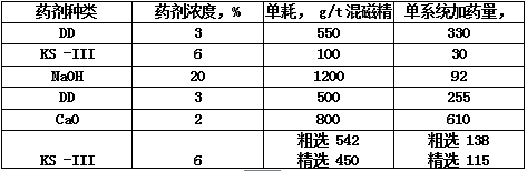 按处理原矿量5500-6000t/d计,混磁精产率33%,即76-83t/d,工业试验系统处理量按65t/h计,正浮选精矿产率15%计,反浮选矿量55t/h计,分步浮选正浮选和反浮选的药剂制度如表所示。