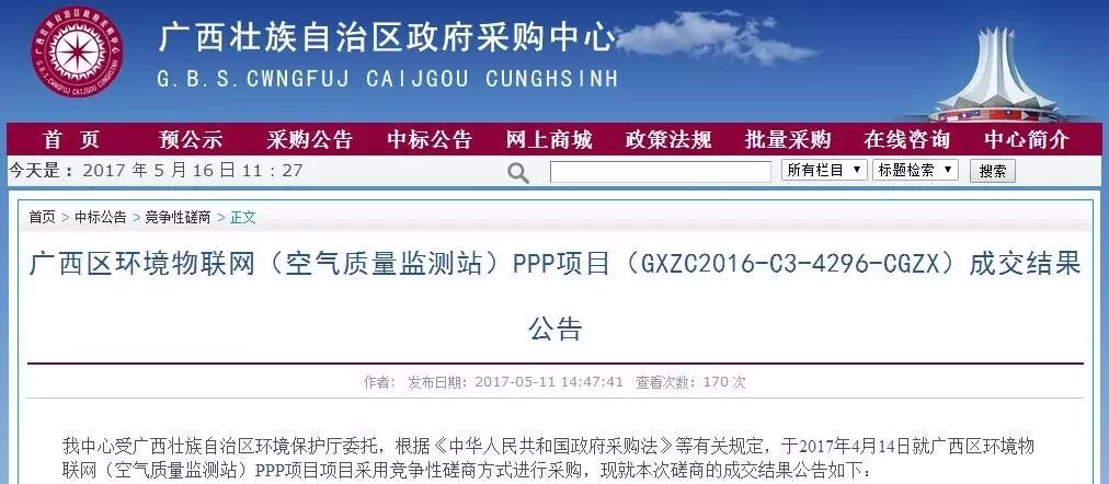 2017年5月11日,广西壮族自治区政府采购中心公告称,广西区环境物联网(空气质量监测站)PPP项目已经完成采购程序,确定社会资本方。该项目是目前在环境质量监测领域落地的首个PPP示范项目,对引导环境监测领域推进PPP模式具有重要意义。项目由环境保护部环规院环境PPP中心提供咨询服务工作。