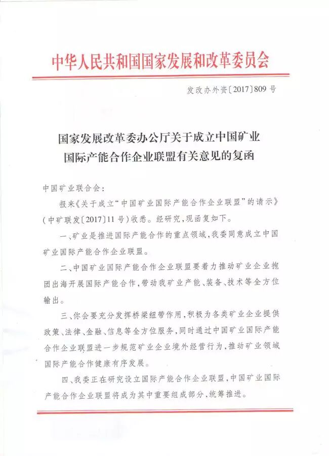 现将国家发展改革委办公厅批复我会关于成立中国矿业国际产能合作企业联盟有关意见的函公示如下。